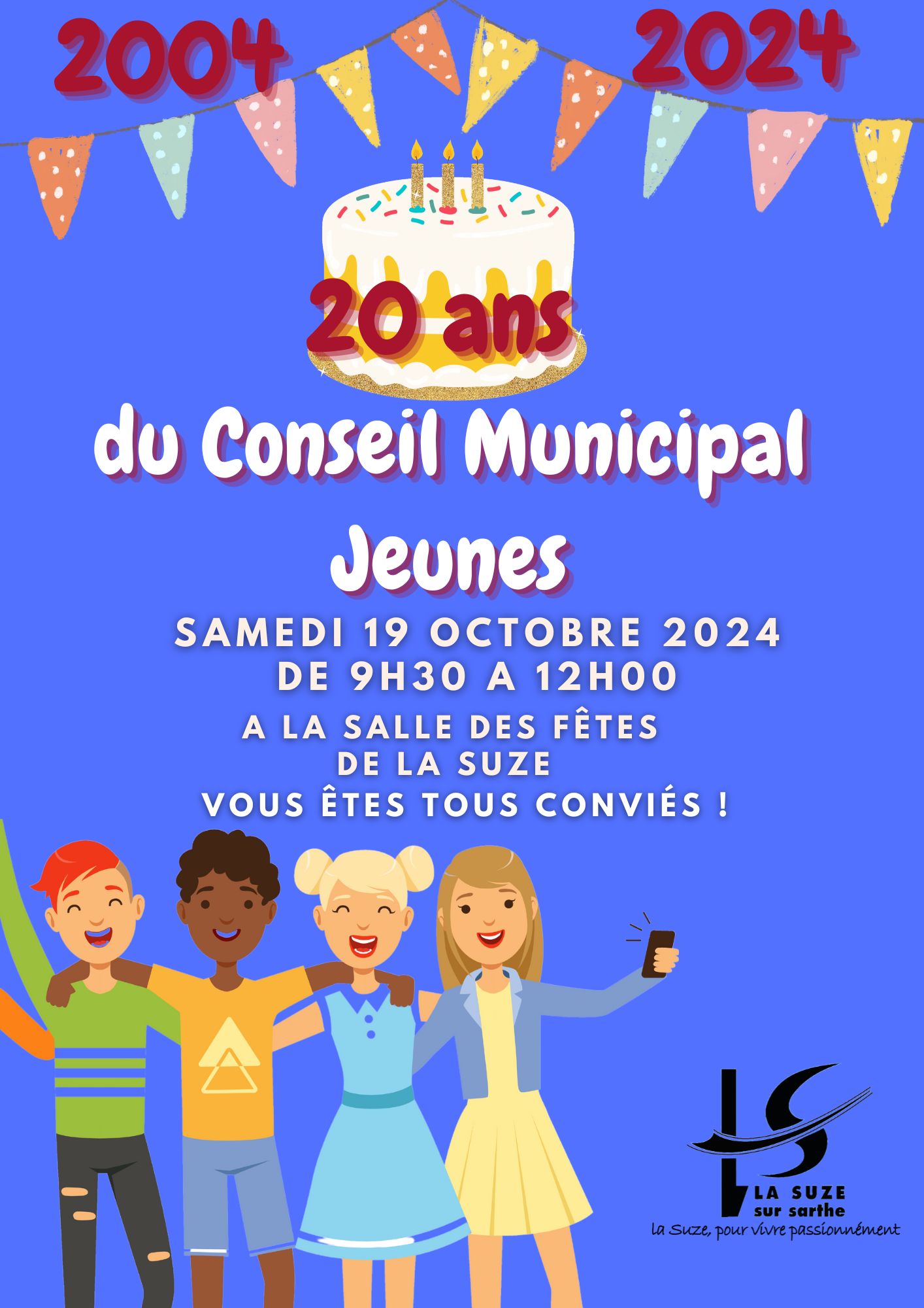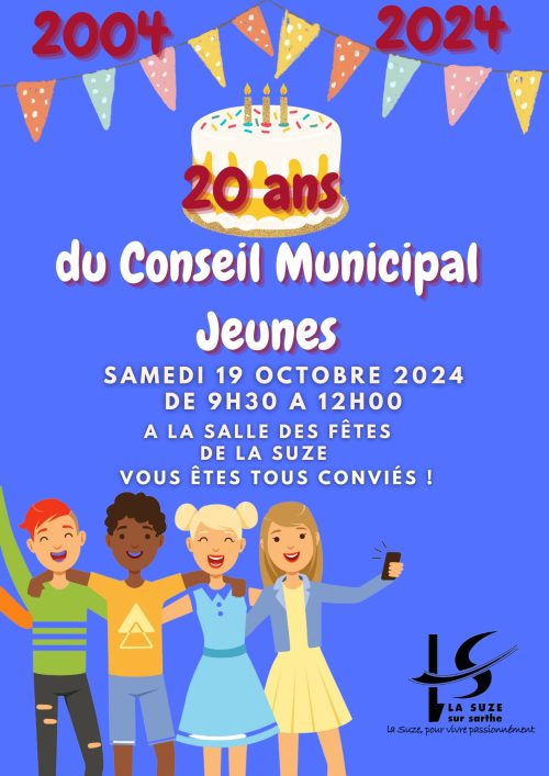 A l’occasion des 20 ans du Conseil Municipal Jeunes de La Suze, nous organisons une exposition le 19 Octobre 2024 de 9h30 à 12h à la salle des Fêtes de La Suze. Ouvert à tous
