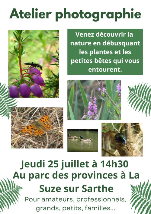 Emma, étudiante en gestion et protection de la nature au lycée de Sées, finit son stage de 2 mois à La Suze. Elle a effectué un inventaire floristique et faunistique dans le Parc des Provinces. Elle vous propose jeudi 25 juillet à 14h30 un atelier photo de la faune et de la flore du Parc des Provinces, une bonne idée de sortie avec les enfants ou seuls, grands, petits, amateurs …tout public.