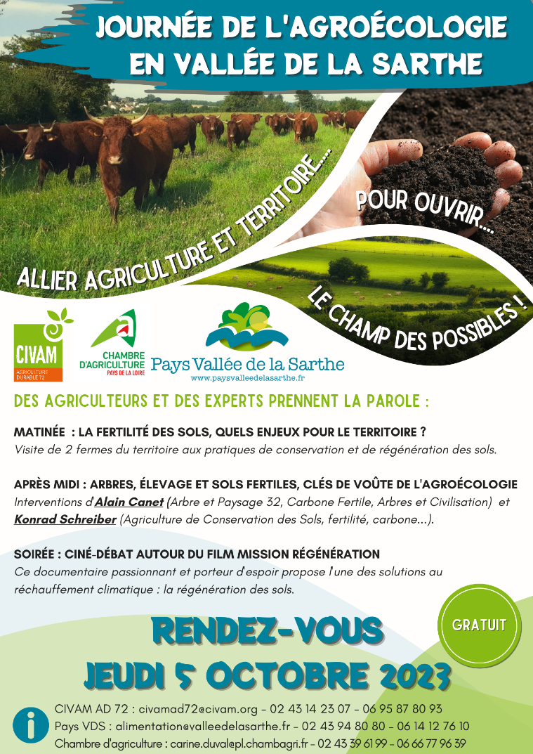 Le Pays Vallée de la Sarthe a lancé en 2021, son Projet Agricole et Alimentaire Territorial (PAAT) dont l’objectif est de « tendre vers la résilience alimentaire et réduire la dépendance aux énergies fossiles du territoire ». Dans ce cadre, est co-organisé, avec le CIVAM AD 72 et la Chambre d’Agriculture des Pays de la Loire, le Jeudi 5 octobre 2023, une :