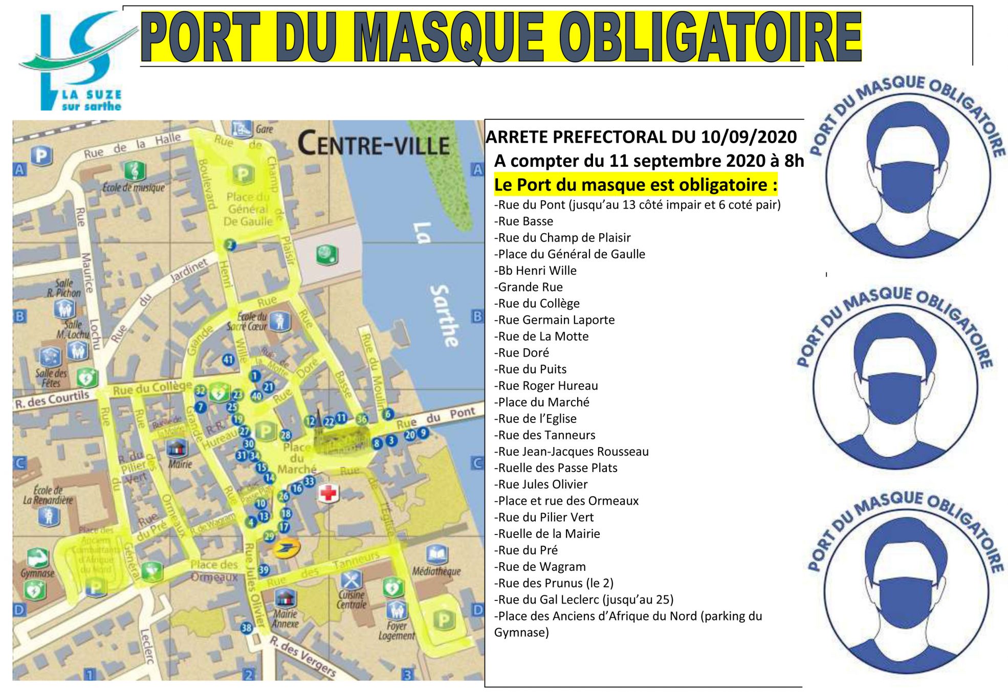 Cet arrêté rendant le masque obligatoire pour les plus de 11 ans dans le centre ville de La Suze est applicable dès maintenant (à compter du 11 septembre 2020 à 8h) et jusqu’au 30 septembre 2020 inclus.