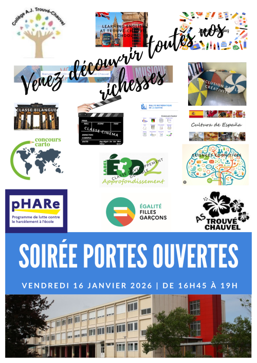 Portes ouvertes du collège Ariste Jacques Trouvé Chauvel 📆Vendredi 16 janvier de 16 h 45 à 19 h Partager sur Twitter Partager sur facebook 297 vues