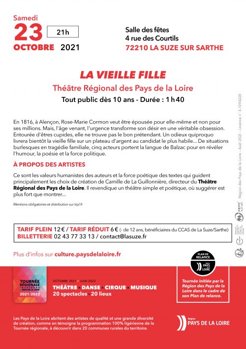 Nous aurons le plaisir d’accueillir le Théâtre Régional des Pays de la Loire le samedi 23 octobre 2021 à 21 h à la salle des fêtes avec la pièce « La Vieille Fille « .