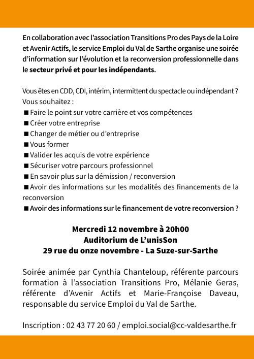 Le service Emploi du Val de Sarthe, en collaboration avec Transitions Pro Pays de la Loire et Avenir Actifs, organise une soirée d’information sur l’évolution et la reconversion professionnelle dans le secteur privé et pour les indépendants.