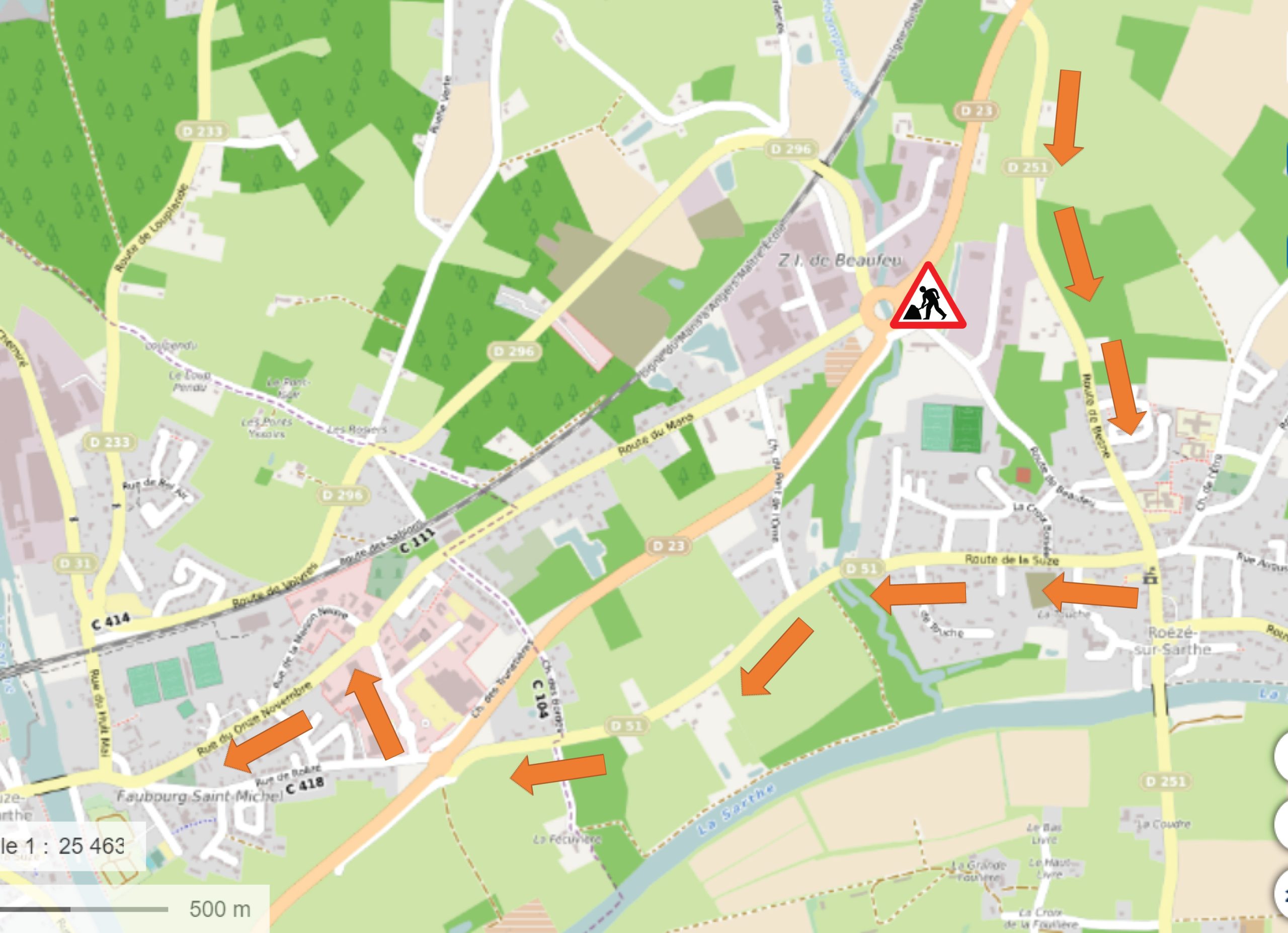 Le giratoire sera fermé à la circulation hormis les cars scolaires, les services d’urgence, les poids lourds et les riverains, une déviation sera mise en place par Roëzé.